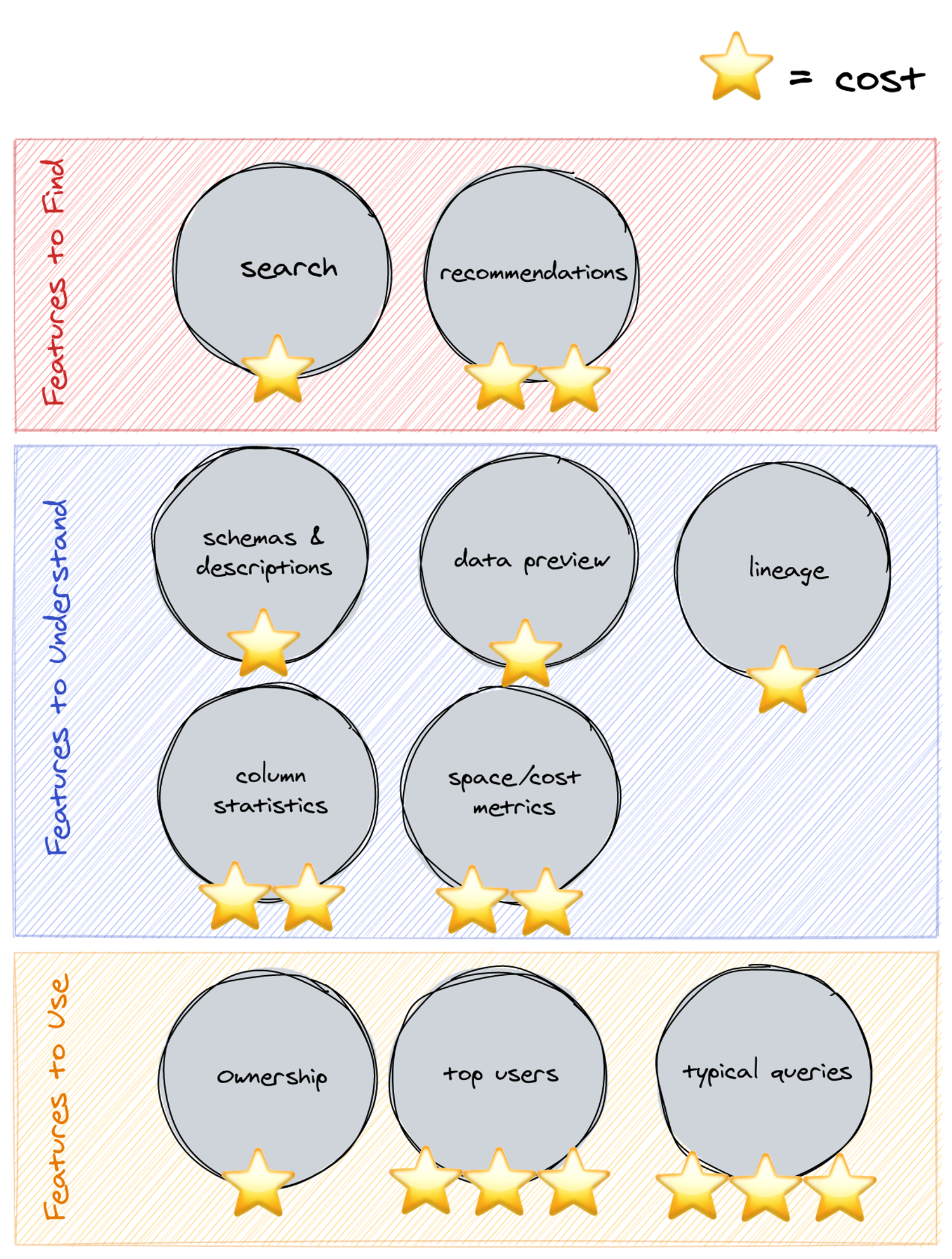 The key thing to realise is that Lyft might have spent a 15⭐️-cost on Amundsen to assemble all those features. But what if we wanted to build a 3⭐️-cost metadata engine? What features and technologies would you pick?