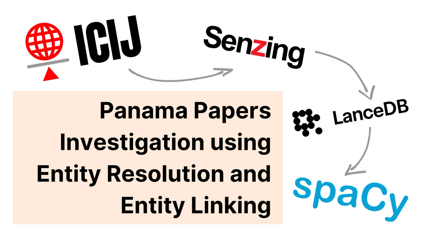 While other tutorials show the ICIJ Offshore Leaks data loading into graph databases and entity resolution with Senzing, this tutorial starts with the Senzing export. With a custom Data Engineering pipeline, we can ingest Entity Resolution results into an Approximate Nearest Neighbors (ANN) index stored in LanceDB. We can then use that index in a spaCy pipeline to run Entity Linking against a small dataset of scraped ICIJ web articles. The end-user can then use the output of the entity linking.