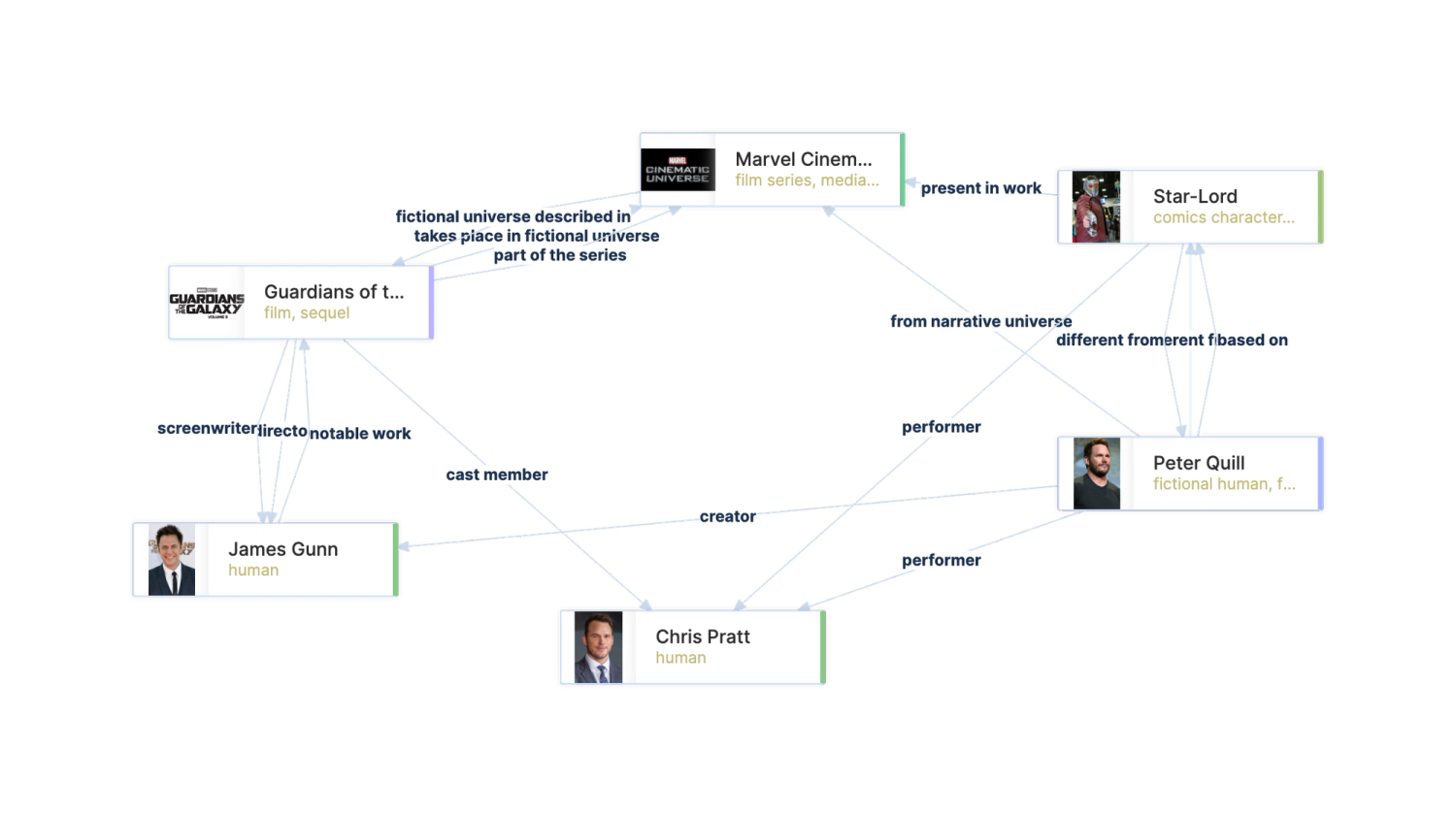 | 3. | triples (Quill, speaks uncensored language in, Guardians of the Galaxy) and (James Gunn, could not imagine, Guardians of the Galaxy) are imprecise | If a triple is found, it should resolve to the most important information. In this case (Quill, is present in, Guardians of the Galaxy) or (James Gunn, directed, Guardians of the Galaxy) | Could be mitigated by using a controlled vocabulary for relationships |